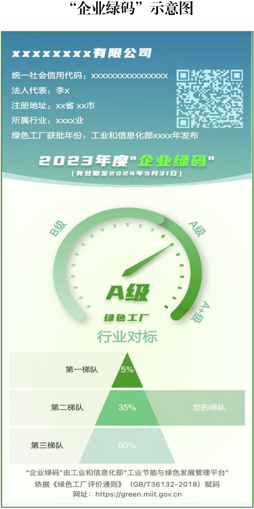 ¶þ¡¢ÎÒ²¿ÒÀ¾Ý¡¶ÂÌÉ«¹¤³§ÆÀ¼ÛͨÔò¡·£¨GB/T 36132£©µÈÏà¹Ø±ê×¼£¬£¬£¬£¬£¬ÒÔ¼°2023Äê¶ÈÂÌÉ«¹¤³§¶¯Ì¬ÖÎÀí±¨Ë͵ÄÂÌÉ«¼¨Ð§Êý¾Ý¿ª·¢ÁË¡°ÆóÒµÂÌÂ롱£¬£¬£¬£¬£¬¶ÔÂÌÉ«¹¤³§ÂÌÉ«»¯Ë®Æ½¾ÙÐÐÁ¿»¯·Ö¼¶ÆÀ¼ÛºÍ¸³Â룬£¬£¬£¬£¬Ö±¹Û·´Ó¦ÆóÒµÔÚËùÓÐÂÌÉ«¹¤³§ÖеÄλÖÃÒÔ¼°ËùÊôÐÐÒµÖеÄλÖᣡ£¡£¡£¡£¡£¹ú¼Ò²ãÃæÂÌÉ«¹¤³§·ÖΪ£Á+¡¢£Á¡¢£ÂÈý¼¶£¬£¬£¬£¬£¬±ÈÀý»®·ÖΪ5£¥¡¢35£¥¡¢60%¡£¡£¡£¡£¡£¡£¹ú¼Ò²ãÃæÂÌÉ«¹¤³§Æ¾Ö¤×ÔÔ¸ÔÔòµÇ¼¹¤Òµ½ÚÄÜÓëÂÌÉ«Éú³¤ÖÎÀíÆ½Ì¨£¨https://green.miit.gov.cn£¬£¬£¬£¬£¬ÒÔϳÆÖÎÀíÆ½Ì¨£©¾ÙÐÐÉêÁì¡°ÆóÒµÂÌÂ롱£¨Ê¾Òâͼ¼û¸½¼þ5£©£¬£¬£¬£¬£¬ÉêÁìºó¿ÉÏòÆä²É¹ºÉÌ¡¢½ðÈÚ»ú¹¹¡¢ÓйØÕþ¸®²¿·ÖµÈ³öʾ£¬£¬£¬£¬£¬Ö¤Êµ×ÔÉíÂÌÉ«»¯Éú³¤Ë®Æ½¡£¡£¡£¡£¡£¡£¡°ÆóÒµÂÌÂ롱ÿÄê¸üÐÂÒ»´Î£¬£¬£¬£¬£¬¼´ÔÚÍê³ÉÄê¶È¶¯Ì¬ÖÎÀíÊý¾ÝÌºó£¬£¬£¬£¬£¬ÏµÍ³»áÔÚÒ»¸öÔÂÄÚÆ¾Ö¤ÐÂÒ»ÄêµÄÊý¾ÝÖØÐ¾ÙÐи³Âë¡£¡£¡£¡£¡£¡£ÈçÆóÒµ²»Ì»òÕßÌ²»¹æ·¶¡¢Êý¾ÝÒì³££¬£¬£¬£¬£¬²î³ØÆä¸³Âë¡£¡£¡£¡£¡£¡£